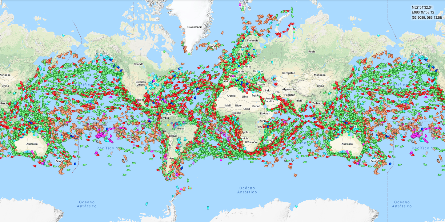 La segunda herramienta que propongo es MarineTraffic, donde podemos consultar una información similar pero relacionada con el transporte marítimo. Aquí me llaman la atención un par de cosas: mientras que el transporte aéreo está relacionado sobre todo con los pasajeros, el transporte marítimo lo hace con las mercancías; y, a diferencia de los aviones, los barcos dependen adaptarse mucho más al medio geográfico, con lo que es más fácil identificar los puntos estratégicos (por ejemplo, el estrecho de Gibraltar, pero también el de Malaca, o los canales de Suez y Panamá).