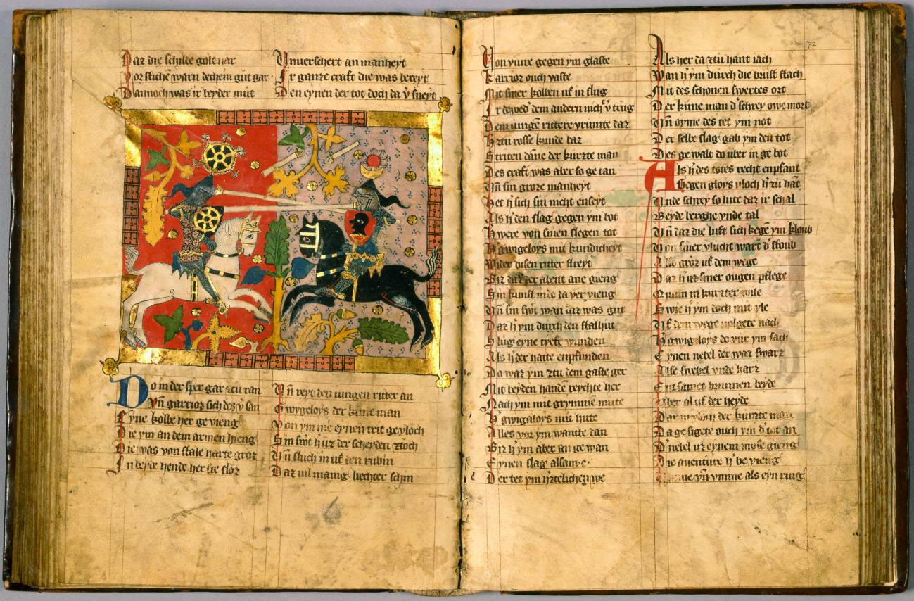 Manuscrito alemán ilustrado que contiene el romance artúrico de Wigalois. Leiden, Biblioteca Universitaria.